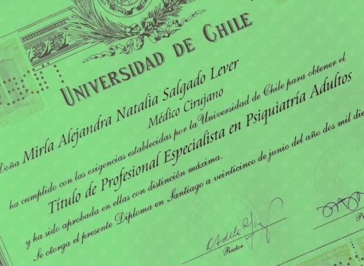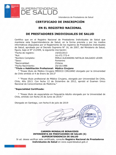 La Dra. Mirla Salgado es Médica Cirujana, titulada en la Universidad de Chile, con distinción máxima. Como recién egresada, ingresó becada a la especialidad de Psiquiatría de Adultos, en la Universidad de Chile (sede Sur, Hospital Barros Luco - Trudeau), titulada, posteriormente, con distinción máxima también. Durante sus años de formación en la especialidad, trabajó en el sistema público de salud, como tratante de pacientes ambulatorios en el Consultorio de especialidad en Salud Mental de la comuna de Santiago, además de desempeñarse como evaluadora de pacientes para su ingreso a hospitalización en distintas Unidades de Corta Estadía, como médica prestadora de servicios para CETEP. Una vez obtenida su especialización y titulada de Psiquiatra, continuó su labor clínica en el Consultorio de Salud Mental de Santiago, en la Unidad de Corta Estadía de Clínica MirAndes en Providencia y en su consulta particular, a través de la plataforma “Doctoralia”. Desde marzo del 2022 a diciembre del 2023, se desempeñó como Psiquiatra en jornada completa en el Servicio de Urgencias del Hospital de Urgencia y Asistencia Pública (HUAP), ex Posta Central. Desde enero del 2024, a la fecha, trabaja en su consulta particular ubicada en Providencia, Santiago. Desde mayo a octubre del 2024 se desempeñó en la Unidad de Corta Estadía en Psiquiatría, del Hospital del Salvador (HdS). Actualmente se desempeña como Psiquiatra en el Hospital de la Fuerza Aérea de Chile (FACH). Desde junio del presente, a la fecha, se encuentra cursando el Diplomado para Psiquiatras sobre Trastornos del Ánimo, dictado por la Clínica Psiquiátrica Universitaria, Universidad de Chile.